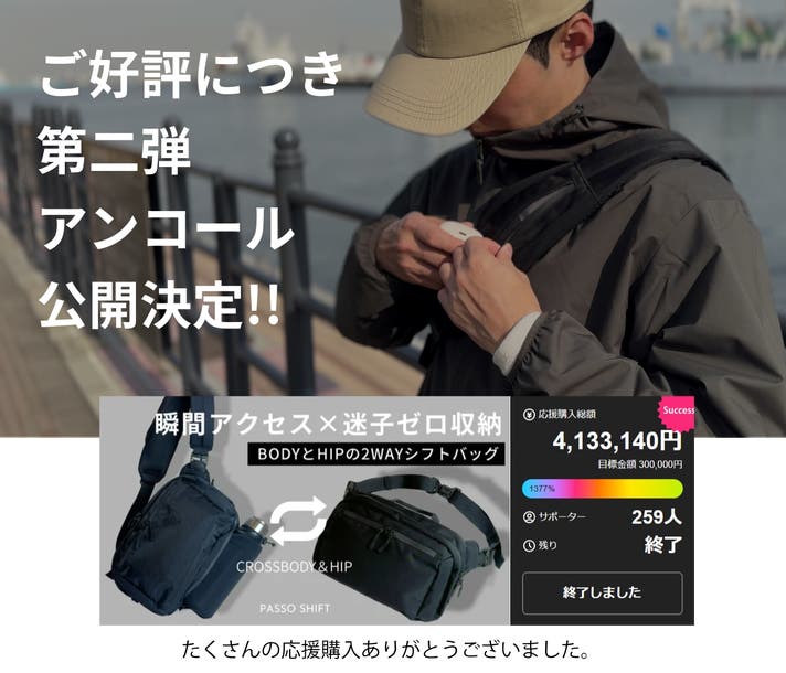 「Makuake(マクアケ)」は、実行者の想いを応援購入によって実現するアタラシイものやサービスのプラットフォームです。このページは、 プロダクトカテゴリの 「【アンコール】迷子ゼロ収納×瞬間アクセス!BODYとHIPでシフト2WAYバッグ」プロジェクト詳細ページです。