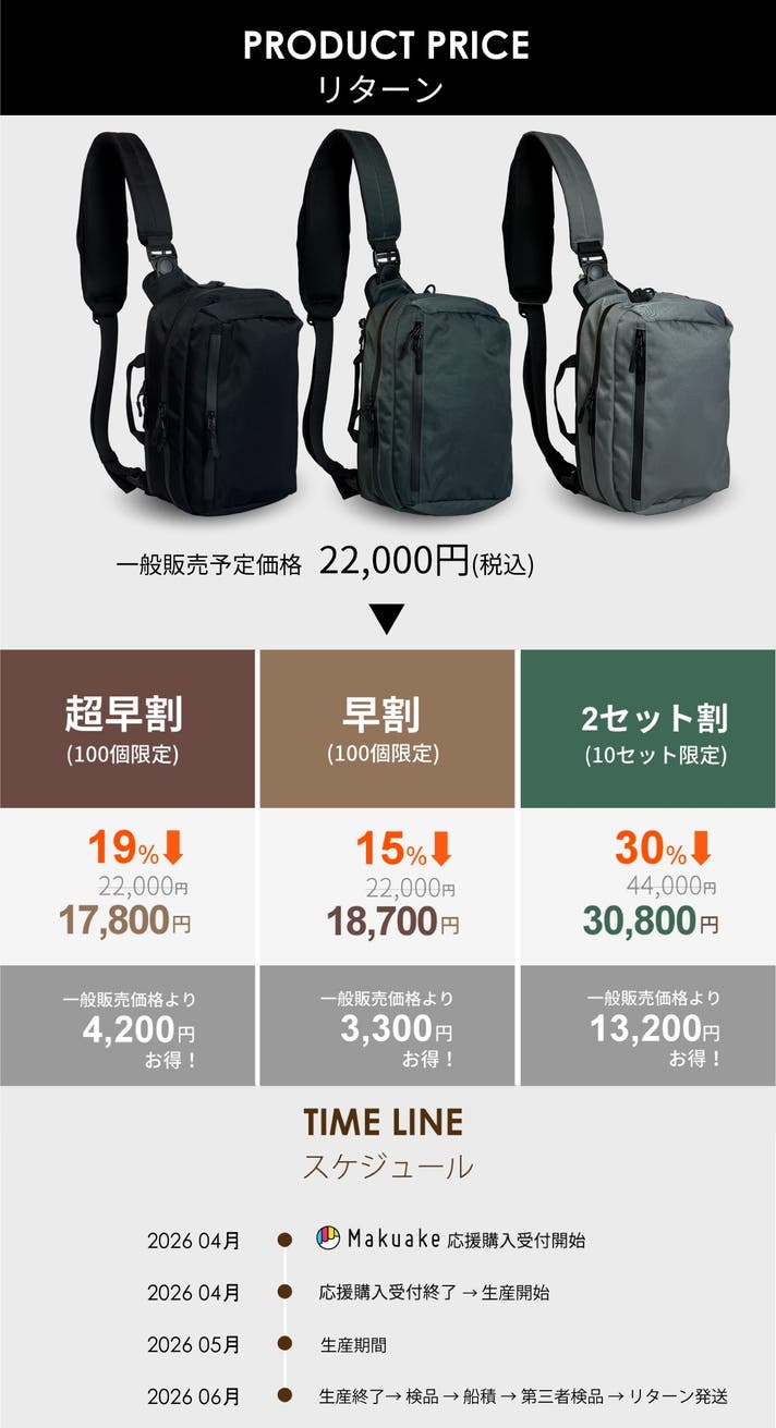 【商品の不具合による返品・交換について】 原則として、サポーター都合によるキャンセル・返金は承っておりません。 (サポーター都合のキャンセル不可の例:イメージ違い、誤注文、長期不在) ◾️対応条件: 商品の初期不良、またはお届けした商品がご注文内容と異なる場合、到着後7日以内にプロジェクトページの「実行者にメッセージ」よりご連絡ください。 状況を確認の上、返金対応、または良品との交換対応をさせていただきます。 ◾️返金額: リターン金額(税込)の全額 ◾️返品送料/再送料: 実行者負担 【返品・交換をお受けできない商品】 ・サポーターの責任により破損、汚損が生じた商品 ・商品のタグ、付属品、パッケージ(箱、袋など)を紛失、破棄された商品 ・事前にご連絡をいただいていない商品 ・商品到着後、8日以上経過した商品 【交換をお受けできないケース】 ・限定品や同一商品の在庫がない場合など、代替品をご用意できない商品 ・使用後のお客様都合による返品・返金はお受けいたしかねます。 ・量産過程で製品の細かな仕様が変更になる可能性があります。 ・お届け時期は予定です。生産事情により多少前後する可能性があります。 ・本文中に記載させていただいたスケジュールは、あくまでプロジェクト公開時点の予定です。応援購入の性質上、配送遅延のおそれがございます。 原則として、配送遅延に伴う応援購入のキャンセルはできませんが、リターン配送予定月から3ヵ月を超えた場合には、希望者に限りキャンセルにて対応させていただきます。 ・国内に類似商品が出回割る可能性がございます。弊社では他社類似品に関してのお問い合わせには対応できませんのでご了承下さい。 ・本プロジェクトを通して想定を上回る皆様から応援購入頂き、現在進めている環境から量産体制を更に整えることができた場合、正規販売価格が販売予定価格より下がる可能性もございます。