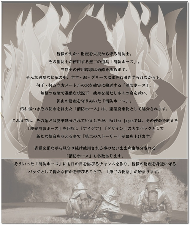 廃棄される消防ホースに新たな息吹を吹き込んでバッグとして生まれ変わらせるアップサイクル(リサイクルの先を行く)という新たな価値観で、これまでにない自己表現やオシャレを楽しんで頂き、広めるためのプロジェクトです。