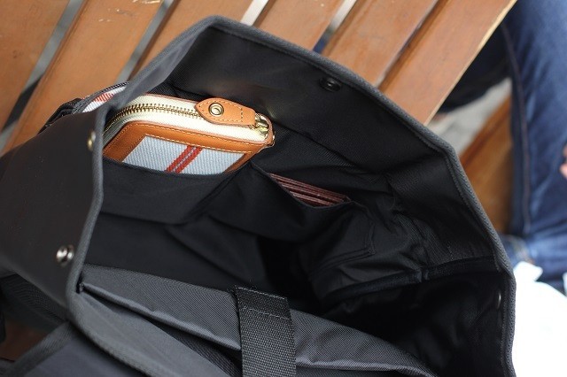 フラップを開けると本体前面にファスナーポケットがあり、A4のクリアファイルが収納できるサイズです。メインポケットとは別に書類等を収納できる便利なファスナーポケット。