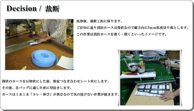 PATINA JAPANでは、このように未使用で破棄される消防ホースを回収し、新しい価値をもった製品として生まれ変わらせています。