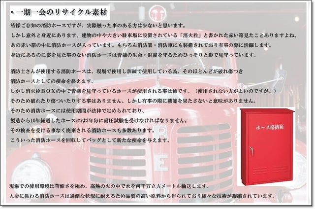 - PATINA JAPANは、「廃棄される消防ホース」を再利用した製品を開発しています。