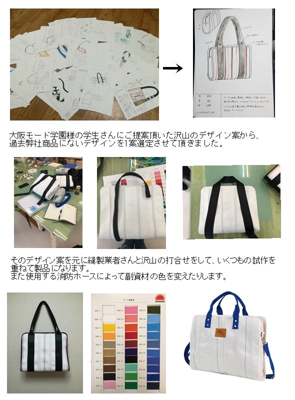 本製品は 「大阪モード学園」様の 「ファッションデザイン学科、グラフィック学科」の学生さん総勢40名以上(1人1案~10案程)に消防ホースを素材にしたバッグ等をデザインして頂き、弊社で最優秀賞を決定させて頂いたバッグになります。