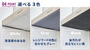 - 白黒グレーの3色を用意。横幅60/75/90cm、奥行60–64cmに対応。