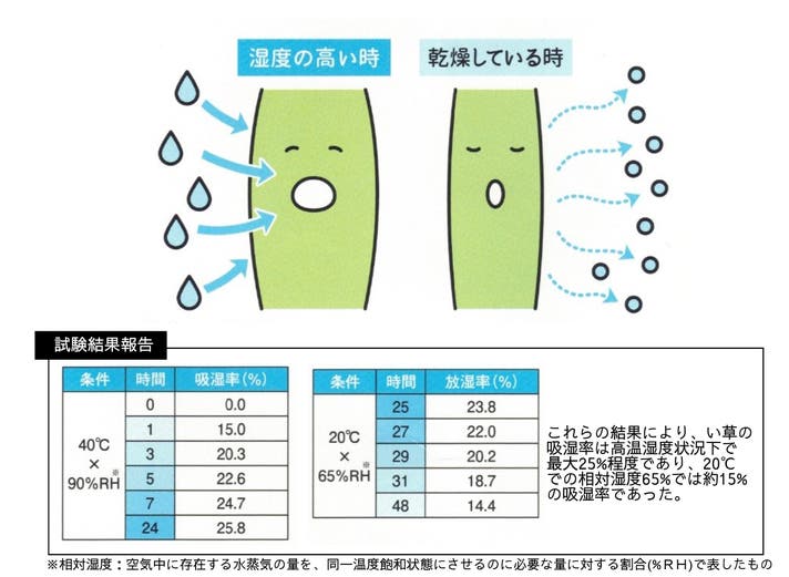 い草は日本の気候にあった優れた素材です。空気中の水分の吸湿・放出を調節します。い草は天然の除湿器・加湿器です。