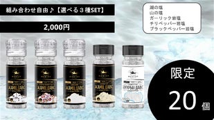 ・【お好きな3種食べ比べSET】湖の塩・山の塩・ガーリック岩塩・ブラックペッパー岩塩・チリペッパー岩塩の計5種の中から、お好きなもの3本SET2,200円(通常価格:送料込・税込3,018円)