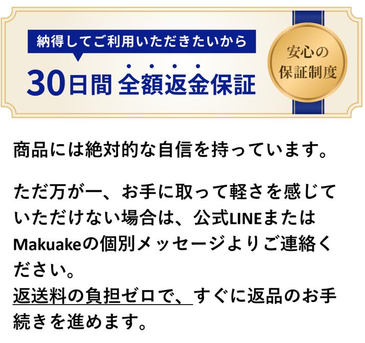実物をみて「思ったのと違う」と感じられた場合は、Makuakeの個別メッセージまたはプロジェクトページ記載のLINEにてご連絡ください。迅速に返品対応を進めさせていただきます。