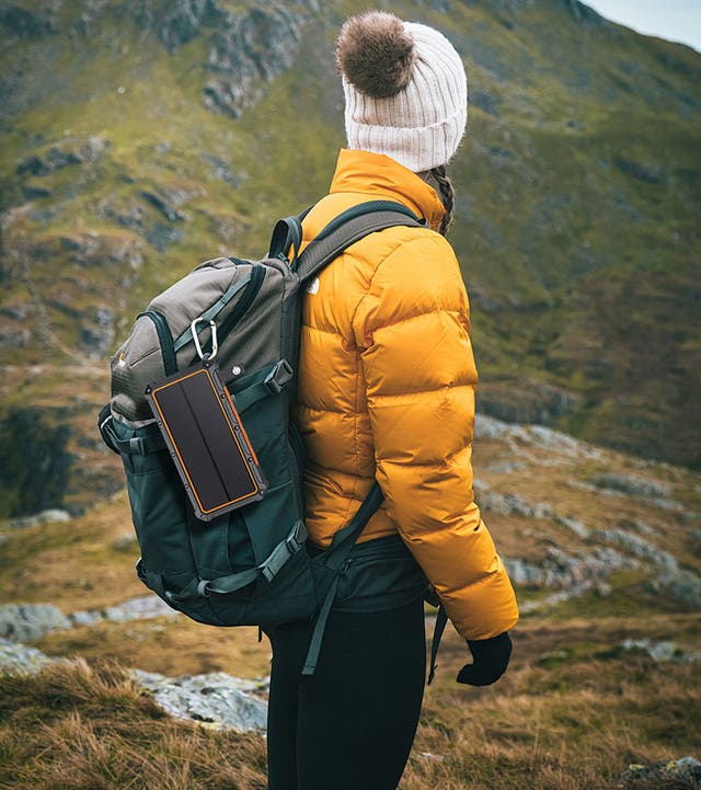 片手で持ち運べるコンパクトさでありながら、20000mAhの大容量バッテリーを搭載。飛行機への持ち込みも可能な規格※。外出先でバッテリー残量が不足してもソーラー充電と手回し充電が可能。
