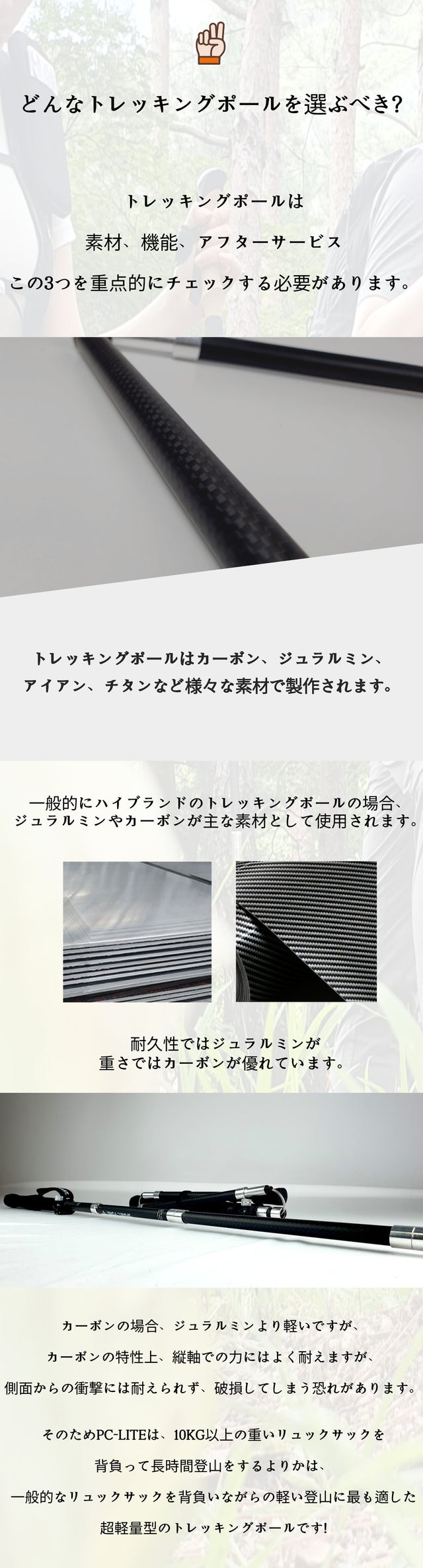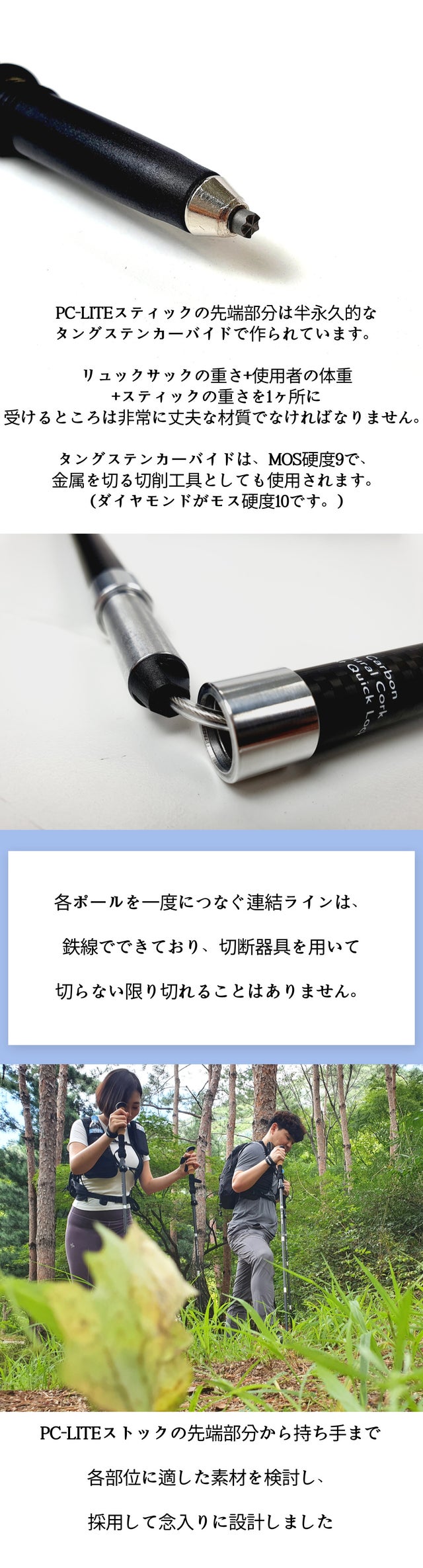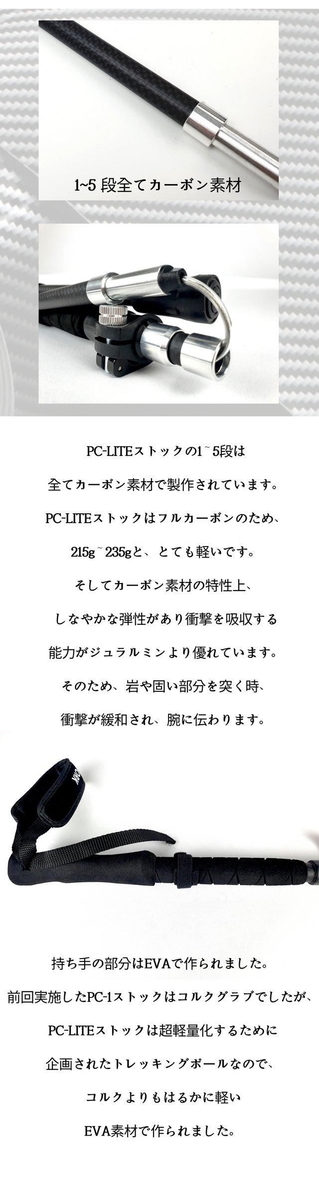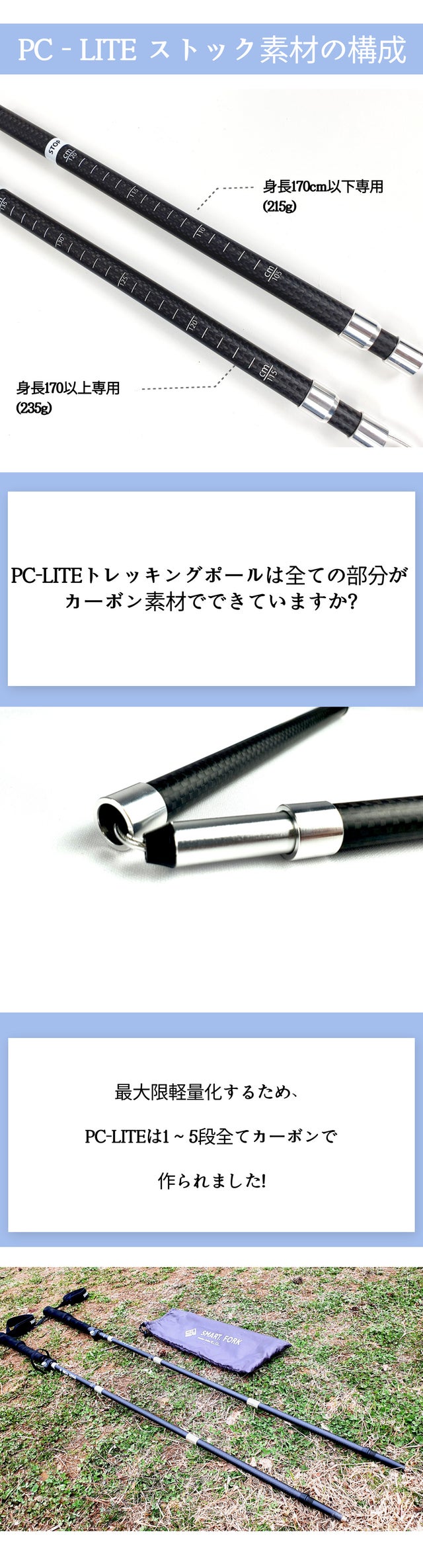 - PC-LITEトレッキングポールはカーボン素材で作られ、170cm以下用はわずか215g!軽量