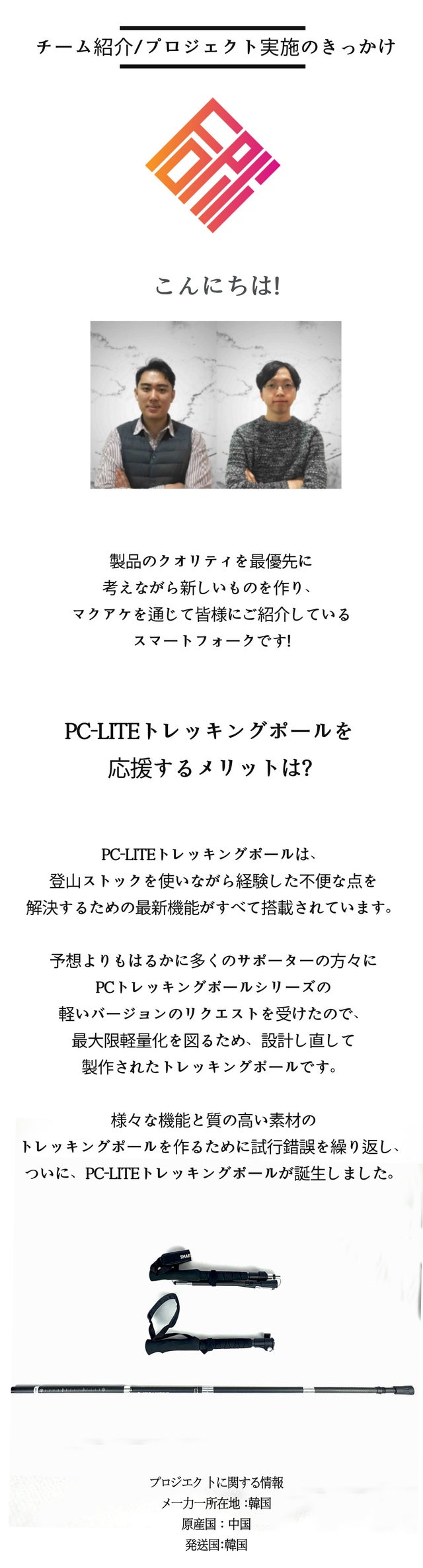 「Makuake(マクアケ)」は、実行者の想いを応援購入によって実現するアタラシイものやサービスのプラットフォームです。このページは、 スポーツカテゴリの 「215gカーボン素材の耐久性に優れたPC-LITE登山スティック!」プロジェクト詳細ページです。