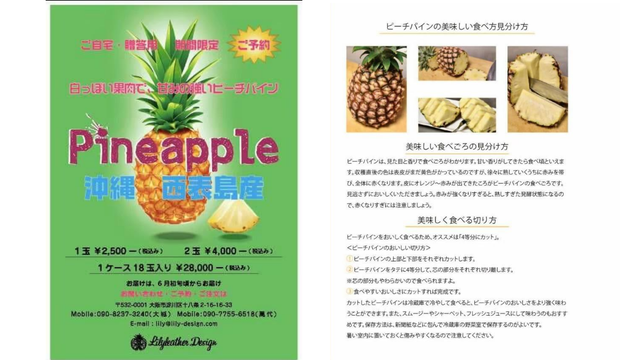 あまりの美味しさに感動し、叔父たちの夢を助ける為にも大阪で販売できないか?!と考えて、さっそく同年の6月~7月Lilyleather Designでテスト販売をスタート。とにかく美味しく食べれる時期を逃してはならない!と必死で宣伝してパインを配ました。
