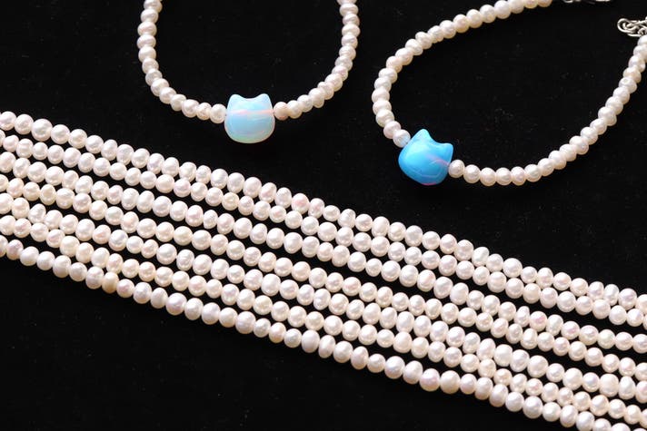 小粒な4.0mm~4.5mmの淡水パールを使用。ナチュラルな形と、天然ならではのツヤとテリが美しいパールです。