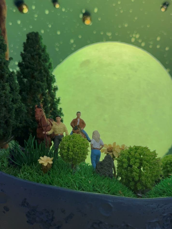 小さなテラリウムの中には、一見すると取るに足らない日常のようなシーンが表現されていますが、遠くから眺めることで、それらの瞬間が決して些細なものではなく、かけがえのない「人生のかけら」として輝いて見えるのです。