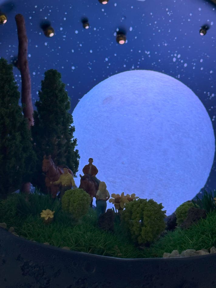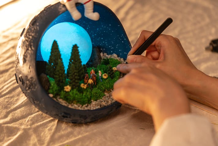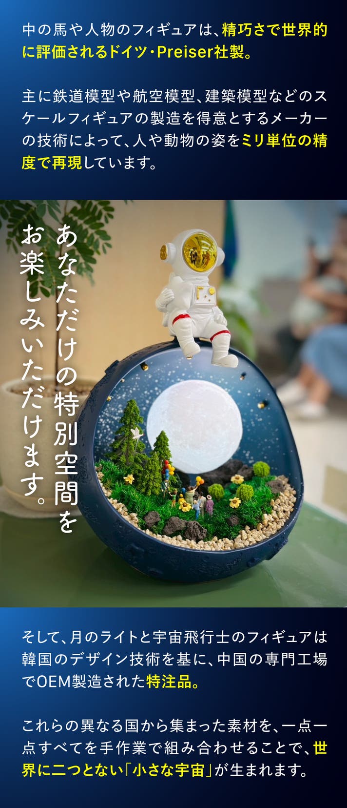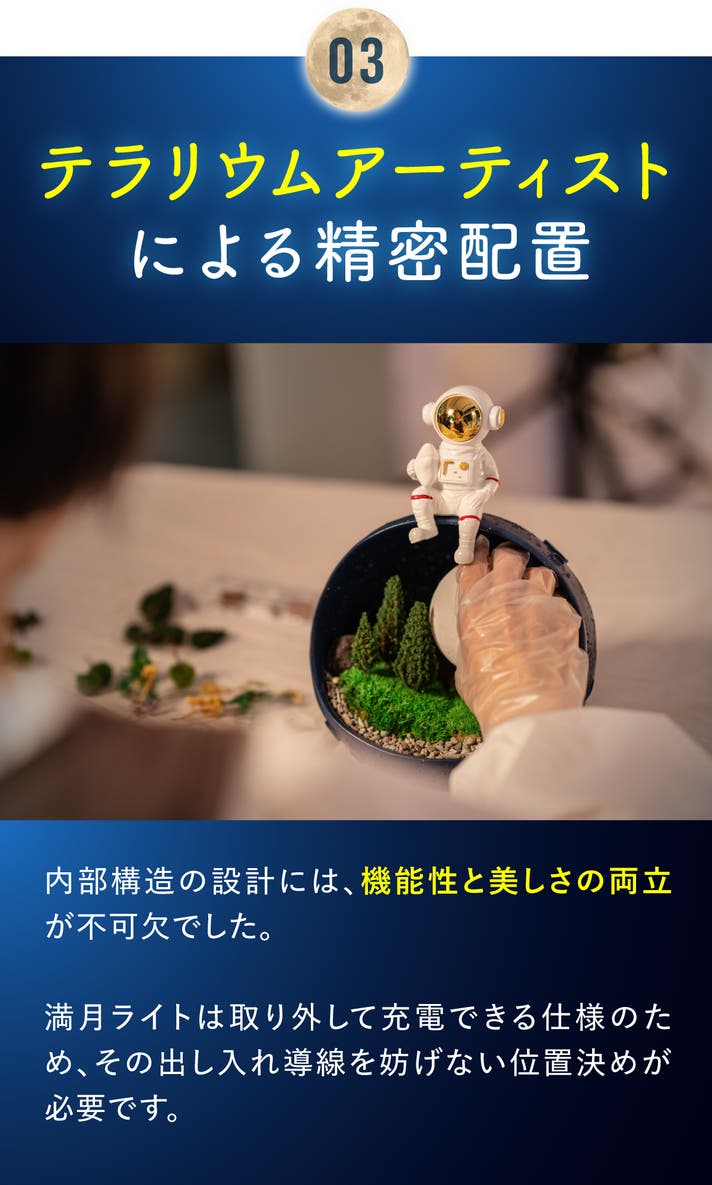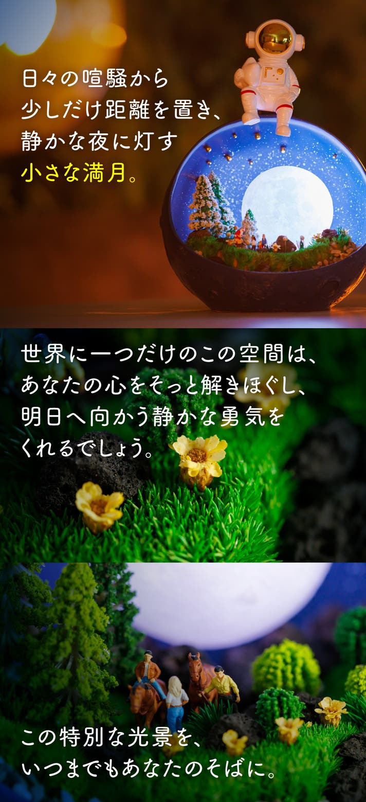 月を中心にしたテラリウムを通じて、見る人が少しでも心が和み、温かい気持ちになってくださることを願いながら、このテーマでの製作を始めました。