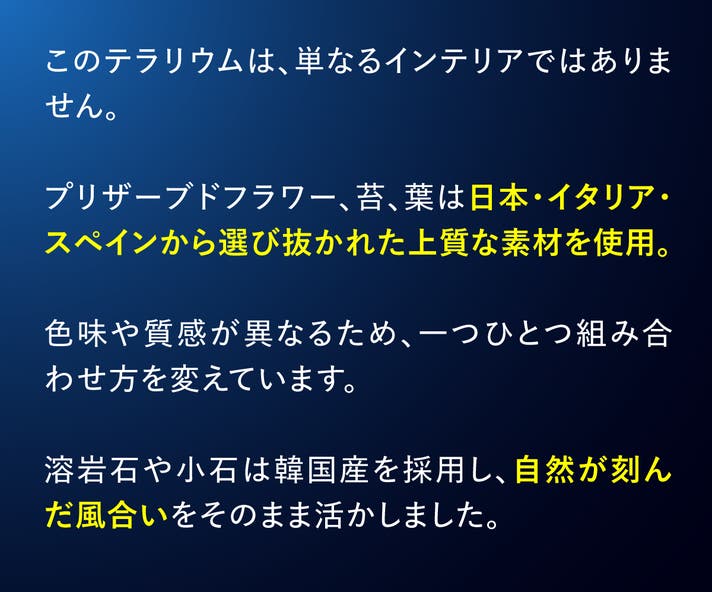A:PEERNAの作品はプリザーブドテラリウムの技術を取り入れています。