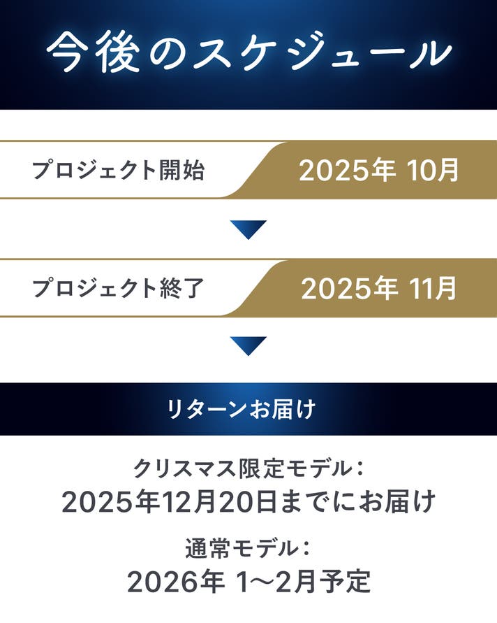 このプロジェクトはAll in型です。目標金額の達成に関わらず、プロジェクト終了日の2025年11月29日までに支払いを完了した時点で購入が成立します。