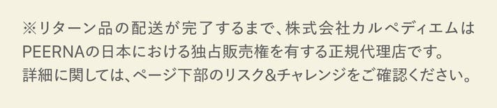 プロジェクトに関する情報 ・プロジェクトの属性:輸入商品 ・代理店によるサポート:初期不良のみ交換対応(お届け日から14日以内) ・プロジェクト実行者(国):日本 ・製品者(国):韓国 ・製造者(国):韓国 ※並行輸入品が発生する可能性があります。正規以外での個人輸入等は、完全に防ぐことができない場合がございます旨、予めご了承のほどお願いいたします。 ※リターン品の配送が完了するまで、株式会社カルぺディエムはPEERNAの日本における独占販売権を有する正規代理店です。並行輸入品が発生する可能性がございますが、並行輸入品には正規代理店による製品サポートを受けることができません。 また、正規代理店を通じて購入することで、日本国内での流通に必要な各種認証の取得や、関税の適切な処理が担保されます。 ※一部国内に類似商品が出回っている場合がございます。弊社では他社の類似品に関してのお問い合わせには対応できませんのでご了承ください。 ※使用感などに関しては、感じ方に個人差が予想される製品でございます。そのため、使用感等に関する返品・返金はお受けいたしかねます。 ※初期不良以外に関する返品・返金はお受けいたしかねます。 ※デザイン・カラー・素材などの仕様が一部変更になる可能性がございます。 ※モニター環境によって、画像の色が実物と異なって見える場合がございます。 ※応援購入の数が想定を上回った場合、製造工程上の都合等により出荷時期が遅れる場合がございます。 ※皆様から想定を上回る応援購入を頂き、量産体制を更に充実させることができた場合、一般販売価格が予定価格を下回る可能性がございます。 ※本プロジェクトはアンコールプロジェクト(*)の実施可能性があります。 (*)アンコールプロジェクトとは、実施したプロジェクトが好評だった場合において、当該プロジェクトが終了後に再び数週間から数ヶ月程度実施するプロジェクトを言います。 アンコールプロジェクト実施の場合、本プロジェクトとアンコールプロジェクトで同じ配送月を設定する可能性もございますが、本プロジェクトのサポーターを優先して配送いたします。 ※本文中に記載させていただいたスケジュールは、あくまでプロジェクト公開時点の予定です。応援購入の性質上、配送遅延のおそれがございます。原則として、配送遅延に伴う応援購入のキャンセルはできませんが、リターン配送予定月から3ヵ月を超えた場合には、希望者に限りキャンセルにて対応させていただきます。 以上の注意点につきましてあらかじめご理解とご了承いただいた上で応援購入くださいますよう、よろしくお願い申し上げます。 最後に、本製品を手に取った皆様に喜んでもらえるよう、チームメンバー一同心を込めて対応していきますので、 応援よろしくお願い致します。
