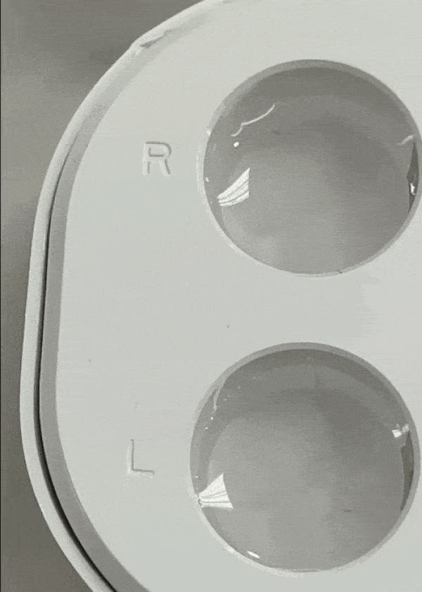 2. レンズを左(L)と右(R)にそれぞれ入れます。レンズケースの中に表示されている線まで洗浄液やリニューを注ぎ入れてください。