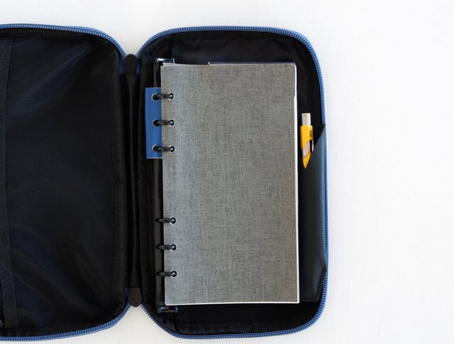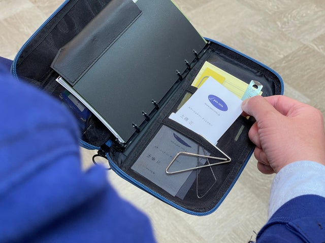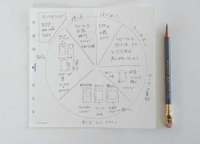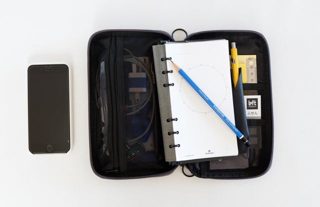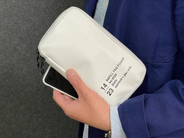 私たちの仕事はスマホやPCなどのデジタルが中心だ。その一方で企画やアイデアを考えるときは自由に書けるペンと紙の方がいい。このポーチは各種仕事道具の収納ができ、手書き仕事もできる「リフィルパッド」というノート(システム手帳)があらかじめセットされている。