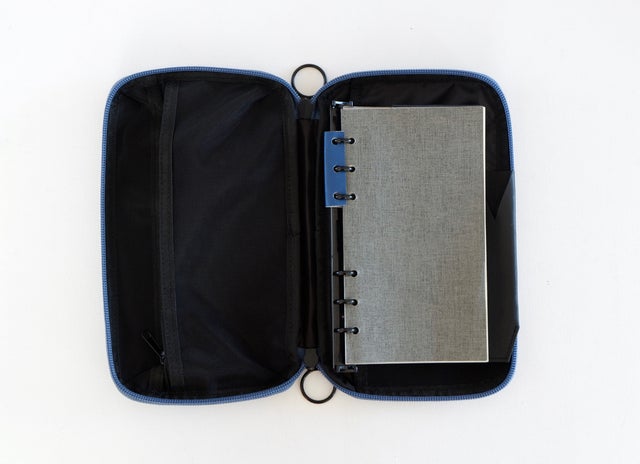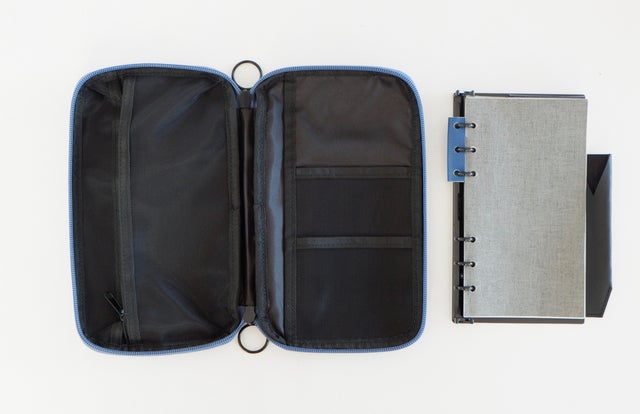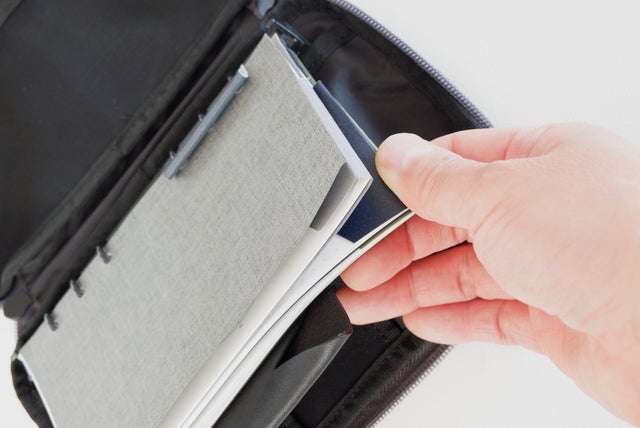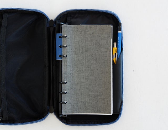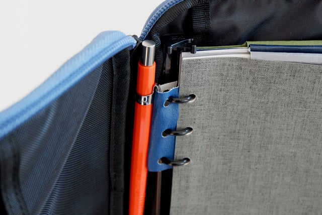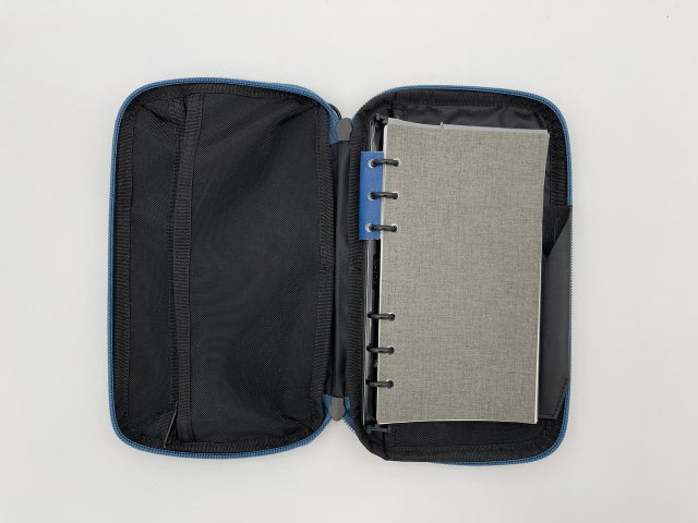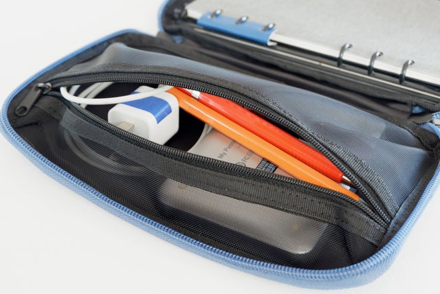 文具派の方は、左側のメッシュポケットをペンケースにしてもいい。何本ものペン、消しゴム、付せん、テープのり、クリップなどを入れておける。