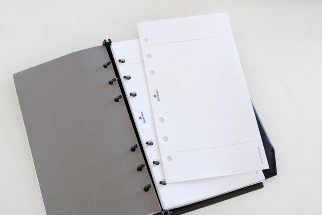 標準でセットされているノートは取り外し可能。ノート自体はシステム手帳なので中にとじ込まれたページもリングを外して取り外せる。このノートには、より使いやすくなるノートリフィルとツールが予め標準セットされている。