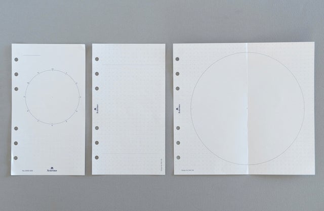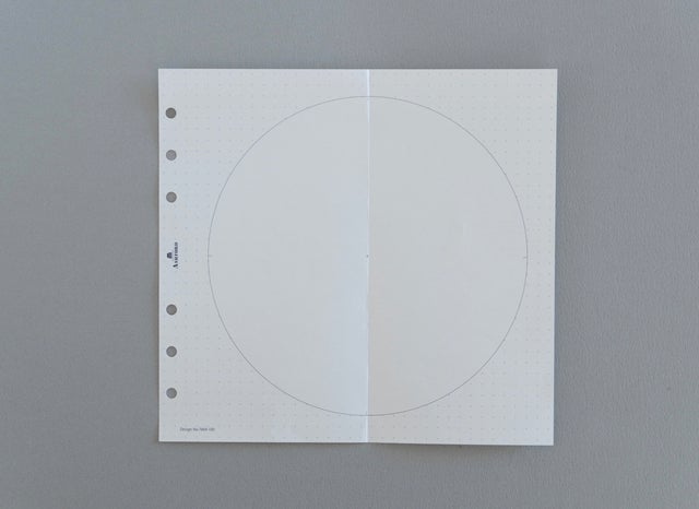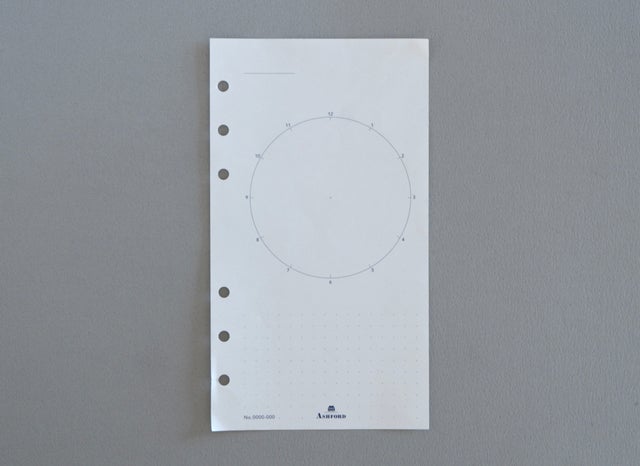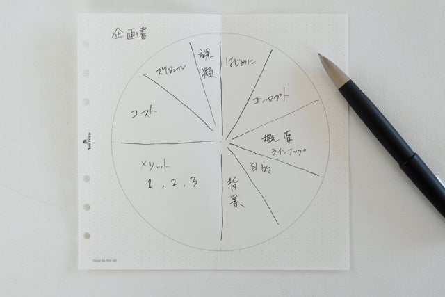 2つ折りされたリフィルを広げると、紙面に大きな円がある。たとえば、仕事で企画を考える、プレゼン内容を考えるといった全体の構成考える時に活用していく。0時の位置に線を引いて、そこから時計回りにグルっと一周して全体と捉える。企画書ならコンセプト、目的、概要、メリット、スケジュールといった項目をどういう順番で、そしてどれくらいの強弱で配分していくかを円を区切りながらプランしていける。