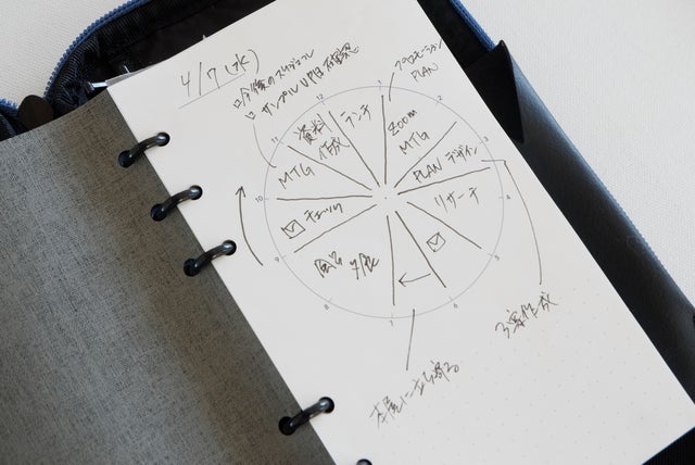 「時計式予定表」は1日のスケジューリングを快適に管理できるノートだ。紙面には時計の文字盤がある。この時計の中を自由に区切ってその日にやるべきこと・やりたいことを直接書いていく。