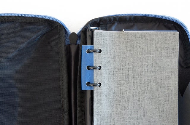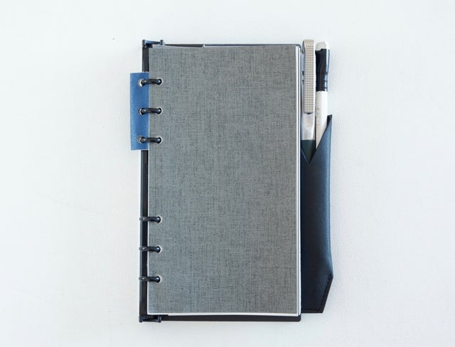 「ホルダータグ」というツールも付属している。ポーチと同じ帆布素材で作られている。これをノートの上側3つのリングに綴じ込んでおく。この小さなツールは、2つの役割を果たしてくれる。ひとつはペンホルダー。ペンのボディではなくクリップをさしておく。すでに「ペンシルホルダー」があるので、予備という位置付けになる。もうひとつの役割はノートの背ラベル、つまりタグである。プロジェクトごとに何冊ものノートを分けるときの目印になる。