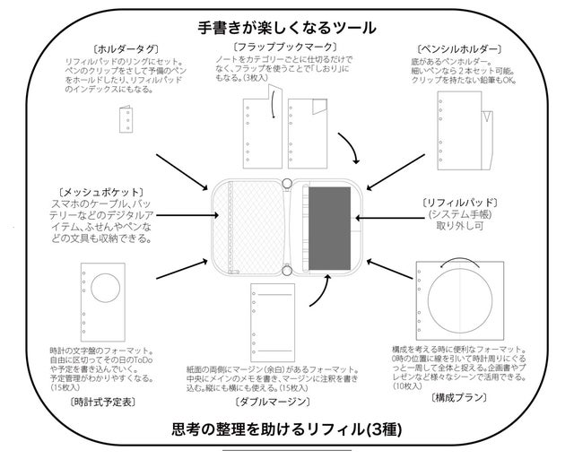 - 思考の整理をサポートするノートリフィルとスピーディーに使えるペンホルダー・しおり付き。