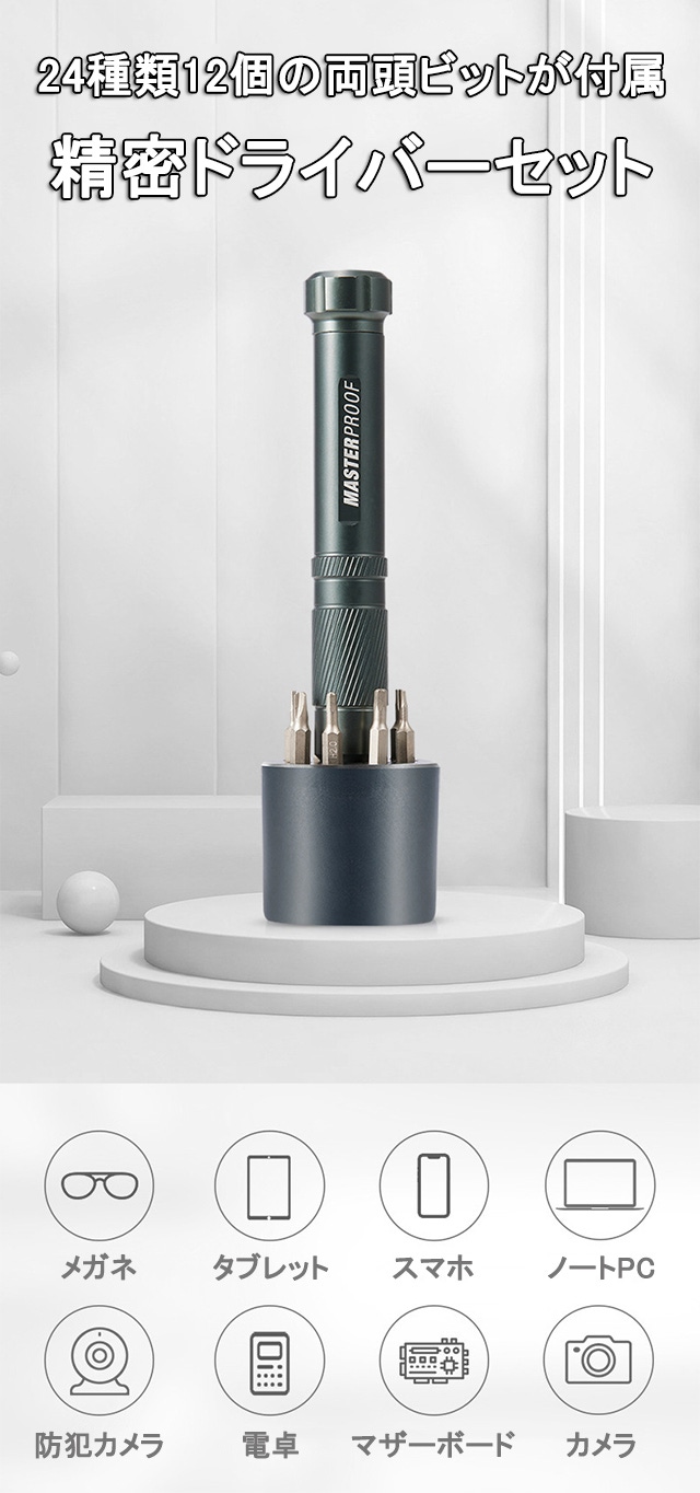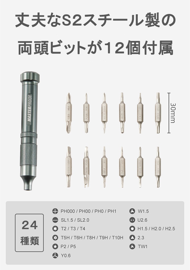 非常に豊富なタイプが揃っており、家庭内の精密機械ならほぼ対応可能な24種類のビット、高品質でネジの溝を痛めたりすることもありません。