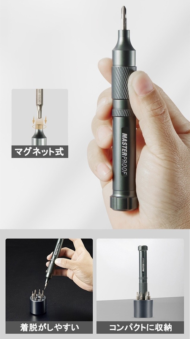 ペン型でコンパクトなため、操作しやすいのもポイントの1つです。時計・メガネ・スマホ・パソコン・精密機器の修理や組立など多用途に使用でき、一般的なドライバーで締められない細かいネジへ差し込む際に大活躍します。