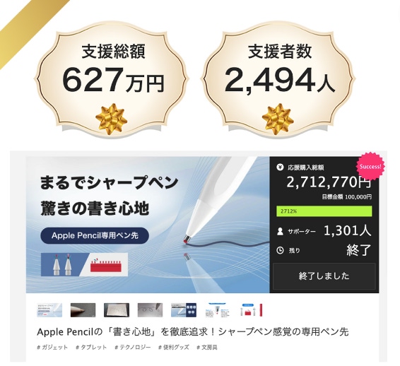 第一弾「pencil tips」は627万円、2,494人の支援者を集めることに成功しました!