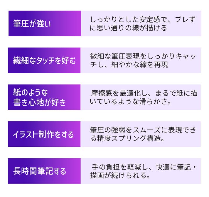 筆圧をコントロールしやすくなり、長時間の筆記や描画でも疲れにくい快適な使用感を提供します。