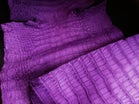 力強く深い溝を刻む大きな鱗模様が、ワニの生命力を表現しています。深く刻まれた溝には紫根染めが豊かに宿り、濃淡の美しいグラデーションを生み出します。影の部分では深い紫が、光の当たる部分では淡い紫が浮かび上がり、自然が描いた水彩画のような表情を見せてくれます。