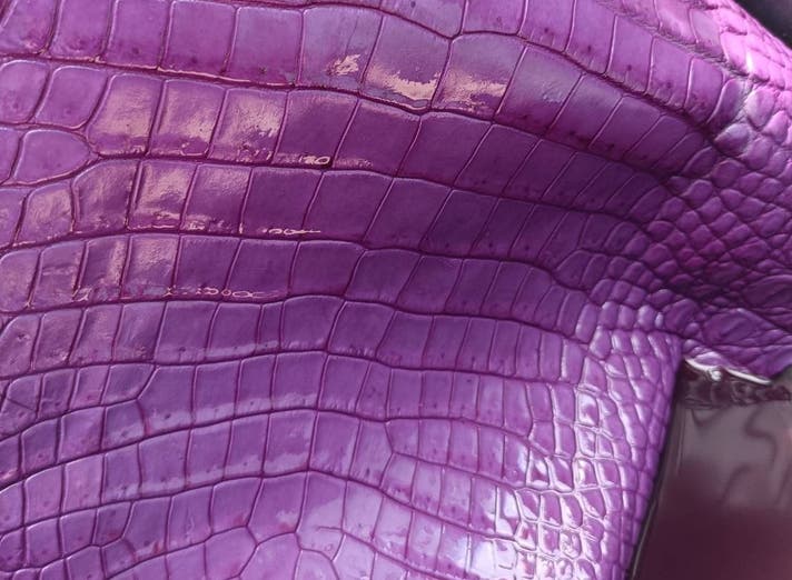 紫根染めクロコダイルレザーは、使い込むほどに手の脂が馴染み、独特の艶と深みが増していきます。紫の色合いも時間とともに落ち着き、あなただけの特別な表情へと変化していきます。