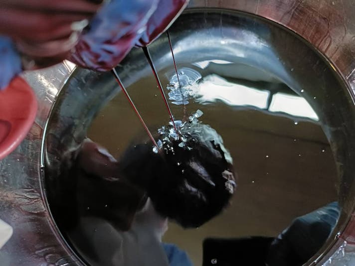 紫根染めは、染めるたびに異なる表情を見せてくれます。その一期一会の美しさを、クロコダイルレザーという素材で表現できることに、職人として大きな喜びを感じています - 染色担当