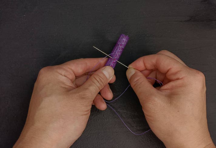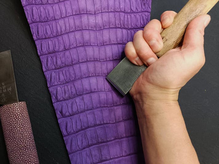 「革職人として、この美しい紫のクロコダイルレザーを扱えることは幸せです。使う方の手に馴染み、長く愛されるペンになることを願いながら、一針一針縫い上げています」 - レザーワーク担当