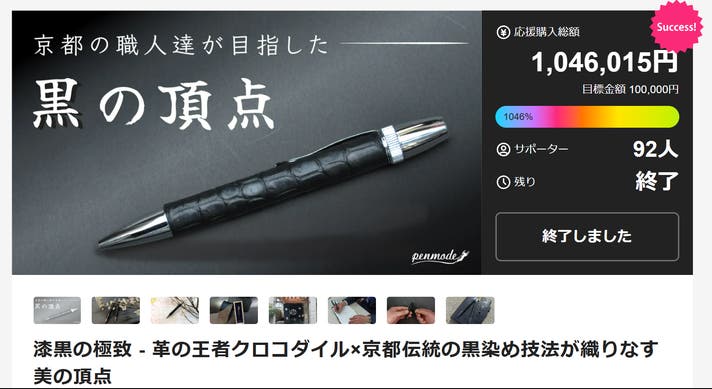 前回、3回目となるプロジェクトの紋付黒染めクロコダイルボールペンは多くの方にご購入いただき目標額の1046%となりました
