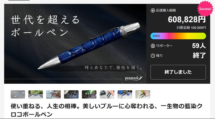 初回のマクアケプロジェクトの「使い重ねる、人生の相棒。美しいブルーに心奪われる、一生物の藍染クロコボールペン」では、目標金額の608%を達成し、多くのお客様からご好評をいただきました。