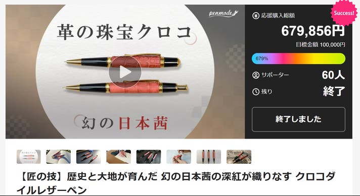 二回目のプロジェクト「【匠の技】歴史と大地が育んだ 幻の日本茜の深紅が織りなす クロコダイルレザーペン」も目標金額679%と多くのお客様にご購入いただきました。
