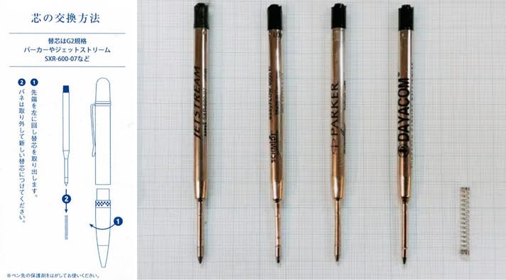 リフィルは多くのメーカーが出しているG2規格が使えます。G2規格は”パーカータイプ” とも呼ばれ海外をはじめいろいろなメーカーで生産されております。あなたの手になじむお気に入りのリフィルを選べることで、末永くご愛用いただける一本となります。