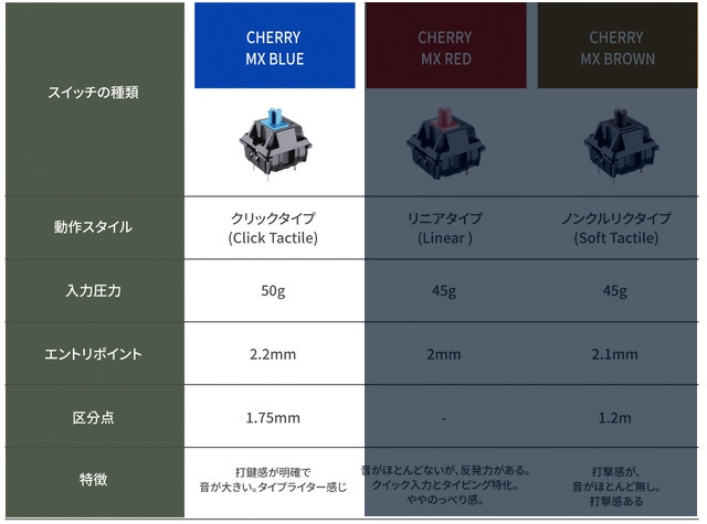 ★世界的なスイッチメーカーであるCHERRY社のMX BLUEのスイッチを使っております。