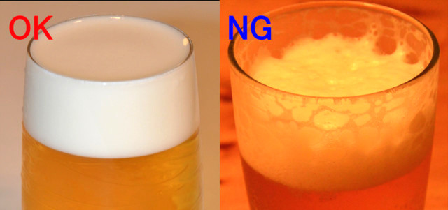 飲食店によっては他の食器と同じスポンジを使用したり、食洗機で洗浄しています。それによりグラスに油分が残り、ビールの泡が粗くなってしまうのです。