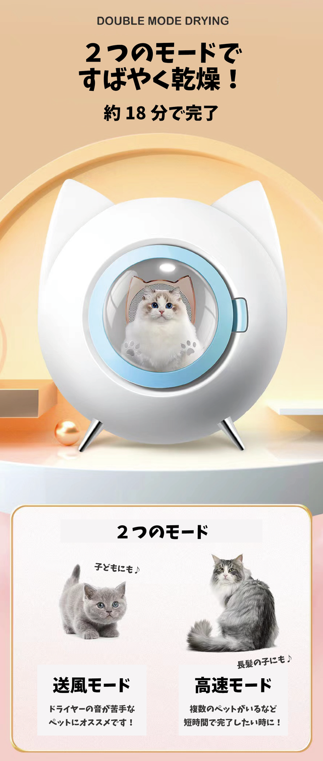 - 送風/高速モードの2つのドライヤーモード!約18分で素早く乾燥♪