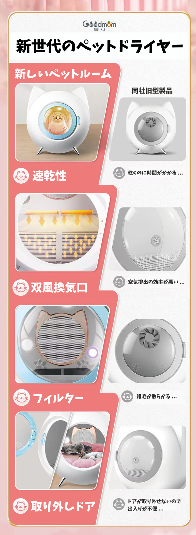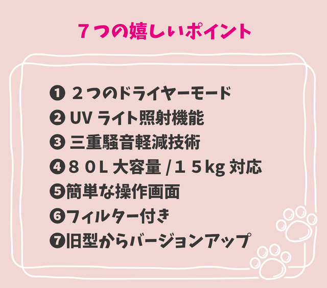- ペットの服やおもちゃにUVライト照射可能!三重構造モーターで強風と騒音の軽減を実現♪