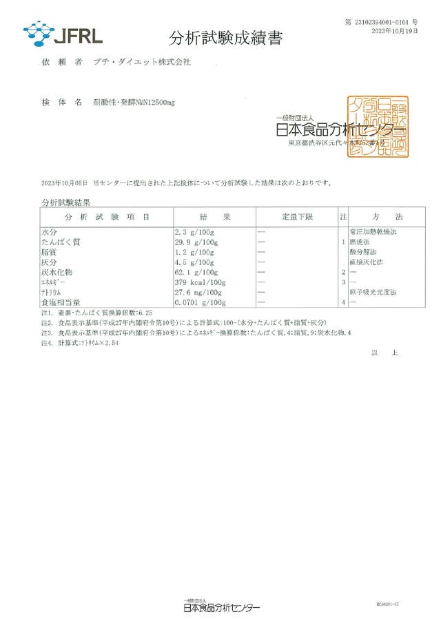 第三者分析研究所(検体提供済) 分析試験成績書(入手済)
