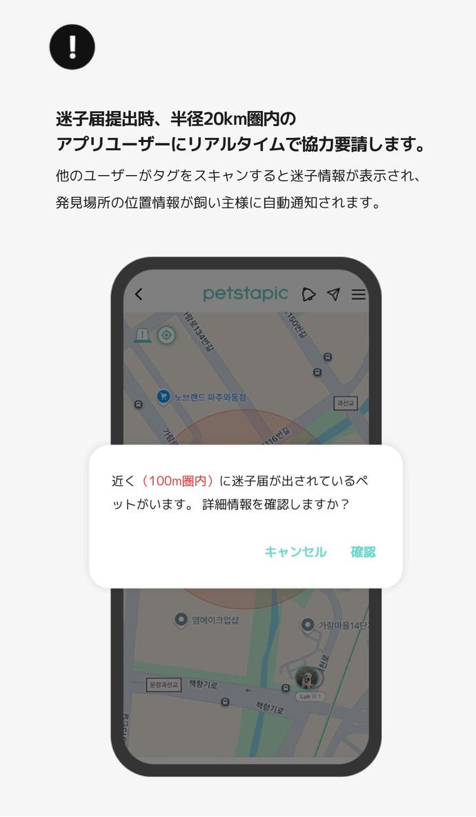 - 半径20kmのコミュニティアラートで、地域一丸となって愛犬・愛猫を探せる
