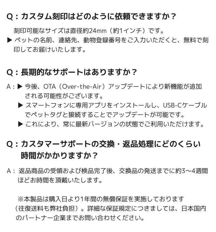 ■ Bremen PET TAG商品は韓国内で製造され、厳格な検品を行った後、順次発送いたします。輸送スケジュールに応じて、できる限りスムーズにお届けできるよう準備を進めてまいりますが、国際輸送・通関の状況により予定が前後する可能性がございます。 ■ デザイン・仕様について 量産工程の最終調整に伴い、パッケージデザインや仕様が一部変更となる場合がございます。大きな変更が生じる際は事前にご案内いたします。 ■ 配送スケジュールについて 本ページに記載している配送予定は、プロジェクト公開時点の想定スケジュールです。応援購入数の増加、製造状況、国際輸送の遅延などにより、配送が遅れる可能性がございます。 ■ 梱包状態について 海外輸送を経るため、十分に配慮した梱包を行っておりますが、外箱に擦れや凹みが生じる場合がございます。製品本体に問題がない場合は不良品対象外となります。 ■ 並行輸入品について 並行輸入品が発生する可能性があります。正規以外での個人輸入等は、完全に防ぐことができない場合がございます旨、予めご了承のほどお願いいたします。並行輸入品は正規代理店による製品保証を受けることができません。また、正規代理店を通じて購入することで、日本国内での流通に必要な各種認証の取得や、関税の適切な処理が担保されます。 ■ キャンセル・返品について 応援購入者都合でのキャンセル・返品はお受けしておりません。初期不良や誤配送があった場合は、到着後14日以内にご連絡ください。状況確認のうえ、交換または返金にて対応いたします。 ※原則として、配送遅延に伴う応援購入のキャンセルはできませんが、リターン配送予定月から3ヶ月を超えた場合には、希望者に限りキャンセルさせていただきます。 ※ 応援購入の性質上、以上の注意点につきましてあらかじめご理解とご了承いただいた上で応援購入くださいますよう、よろしくお願い申し上げます。