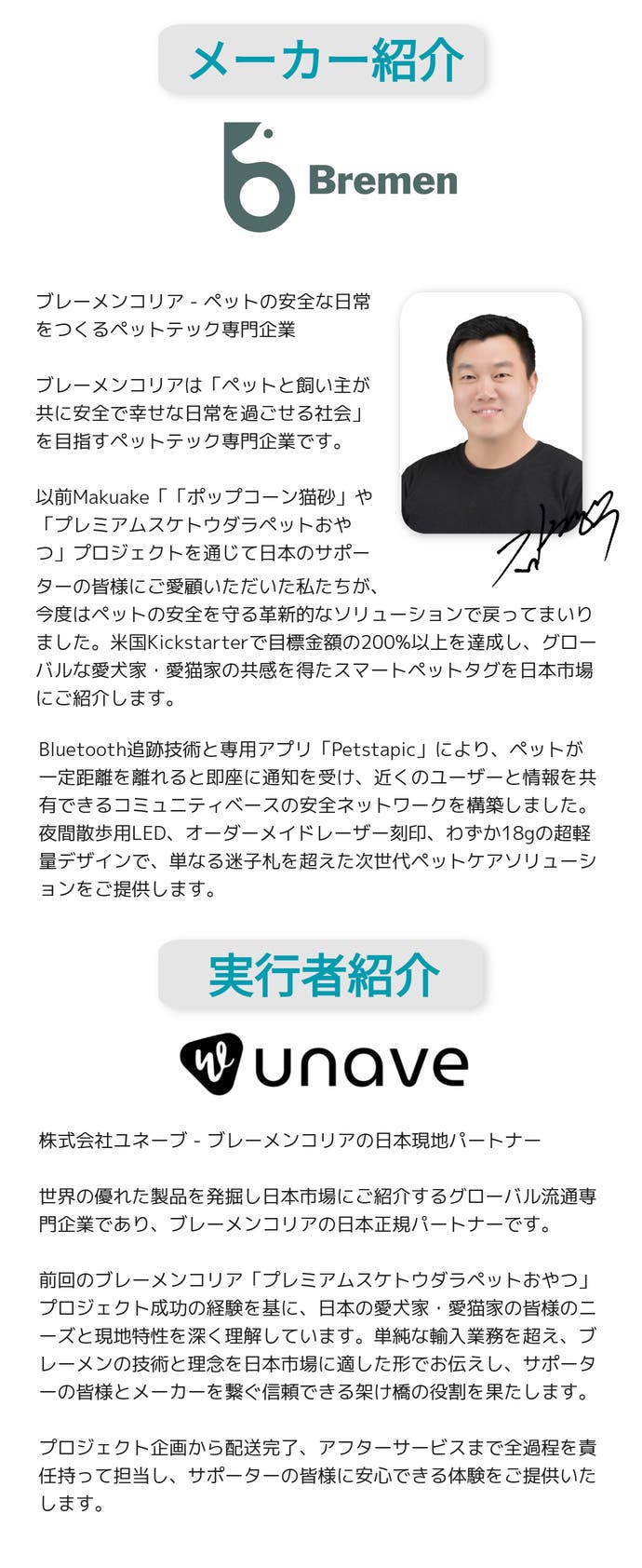 Bremen PET TAGの配送が完了するまで、ユネイブ株式会社(実行者)はブレーメン株式会社(メーカー)の日本における独占販売権を有する正規代理店です。詳細に関しては、ページ下部のリスク&チャレンジをご確認ください。