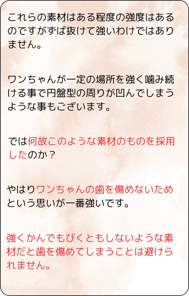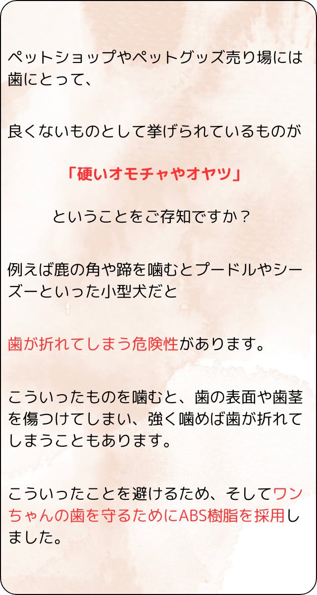 ワンちゃんの歯を傷めないために硬すぎないABS樹脂で作っておりますが簡単に破損してしまうようなことはございません。